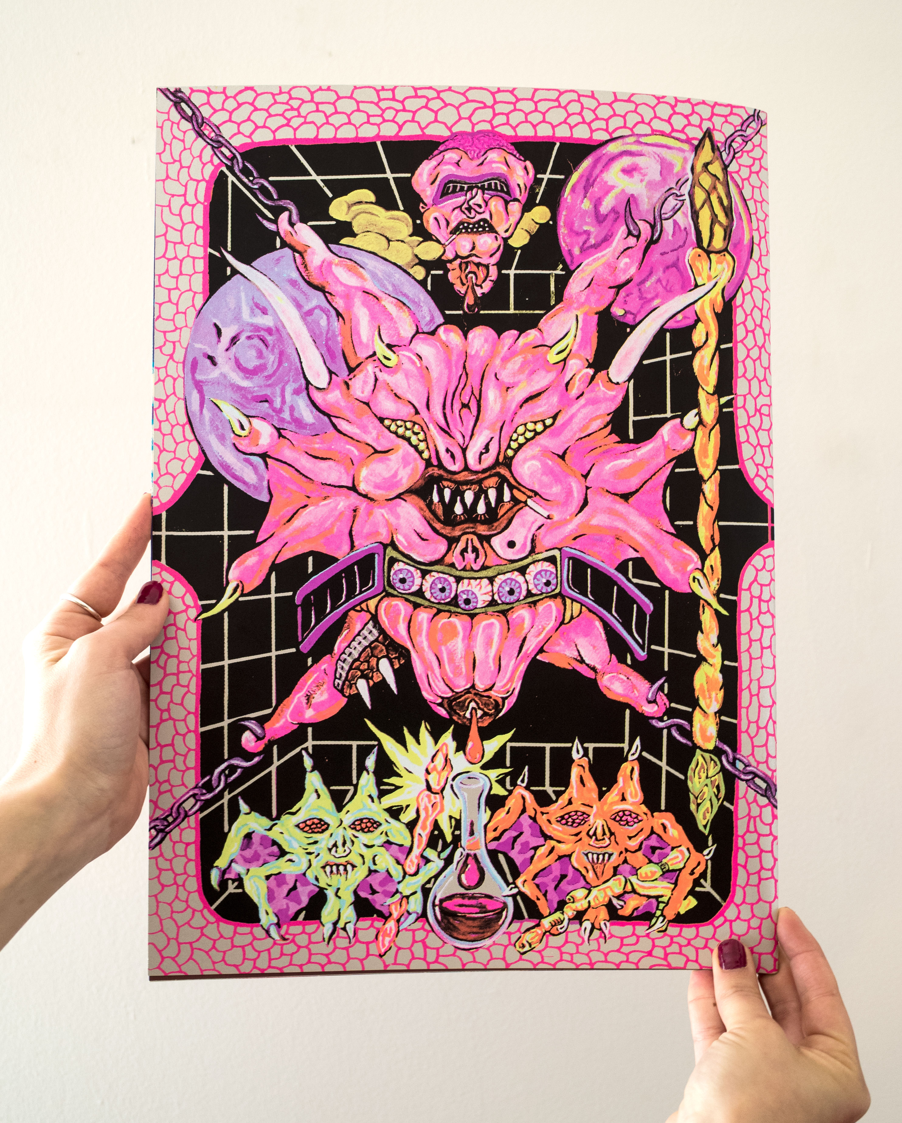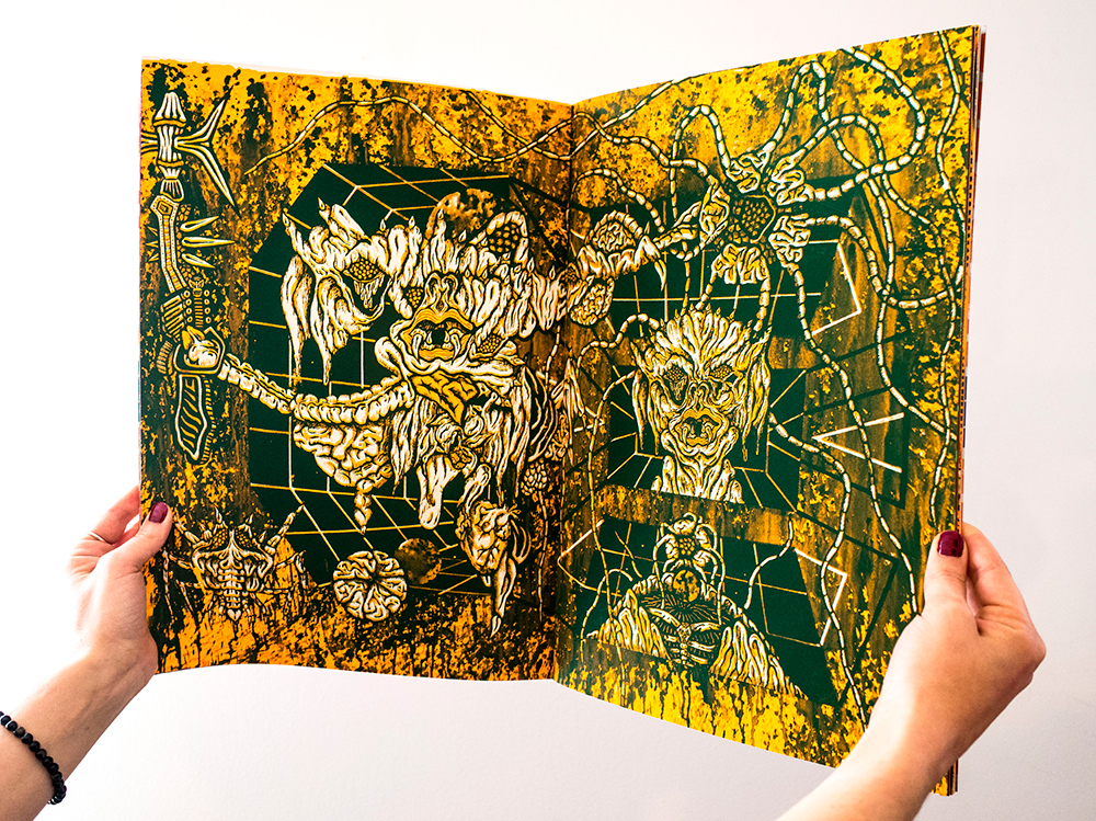 Silkscreen printed illustrations book 30 cm / 4I cm - 24 pages / 17 colors / all sickscreen / ivory paper 260 gr and cover metallic paper 320 grm / 150 copies