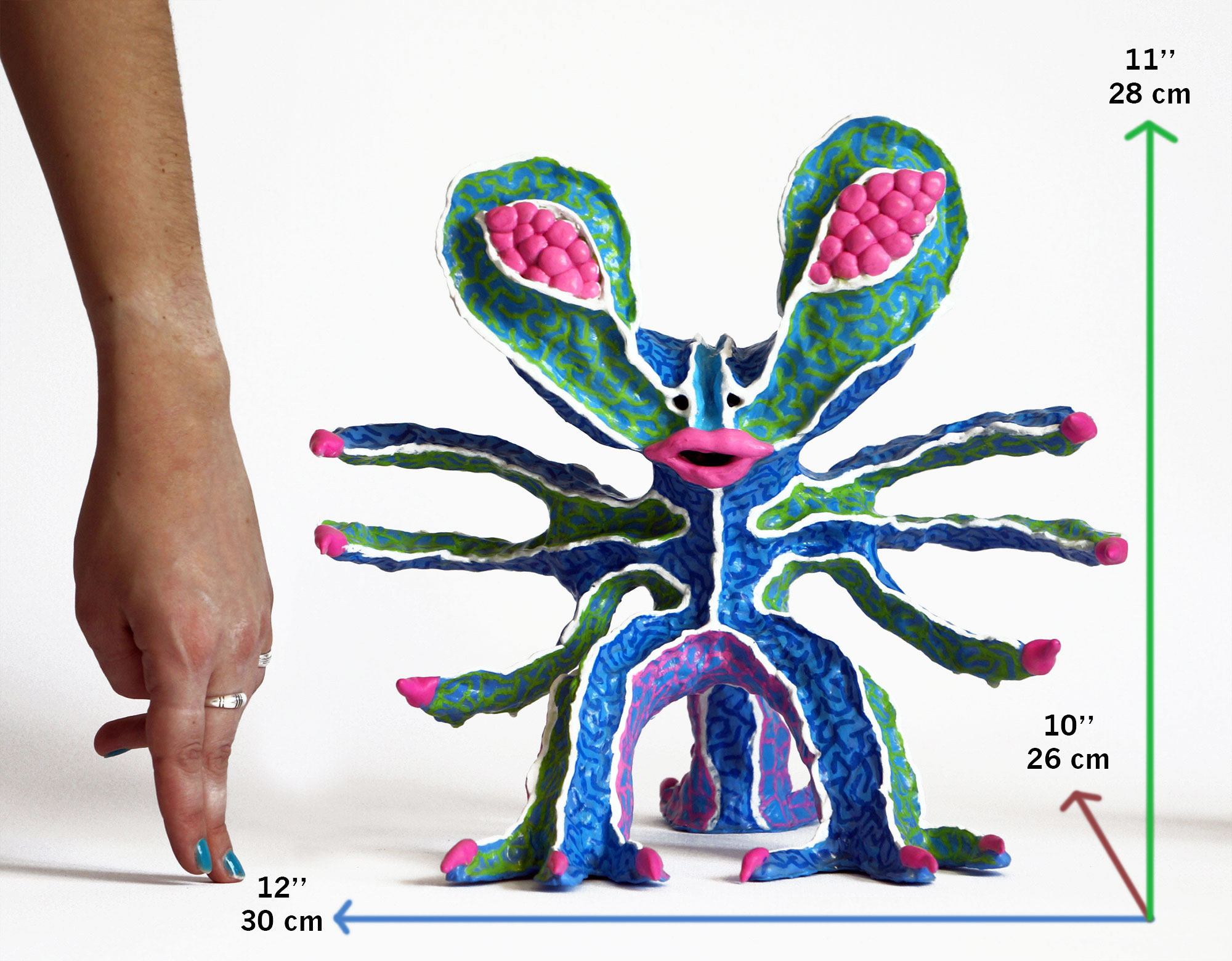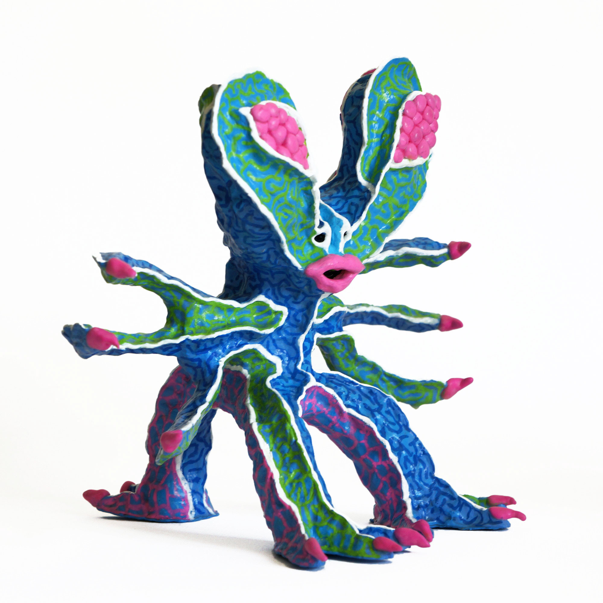 "Monster #3: HYFLUBINES" is a toy sculpture measuring 11" tall. It has been created by Diego Lazzarin in air drying clay, painted in acrylics and finished in vinyl glue to protect it. Signed and ready to display.
