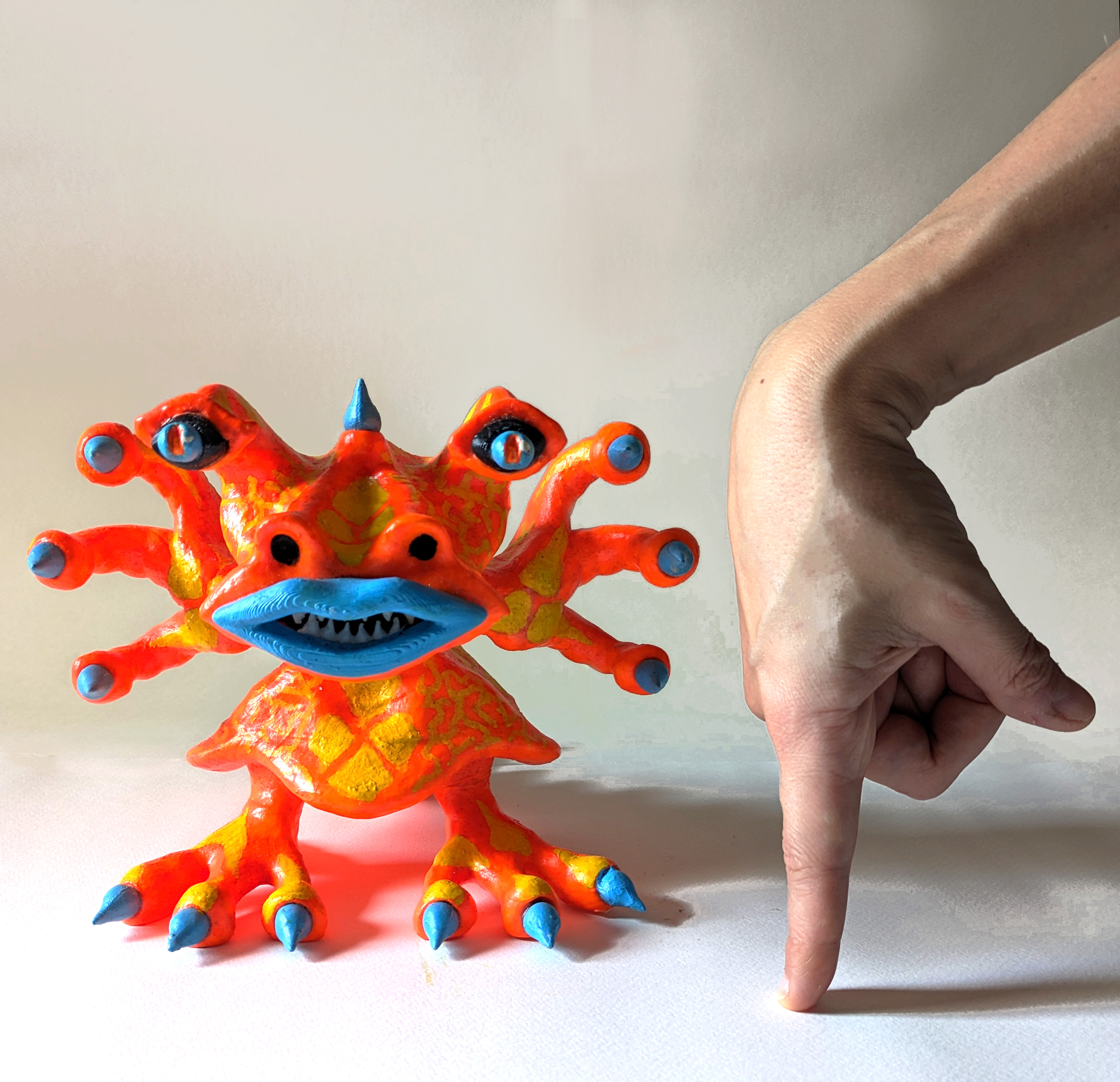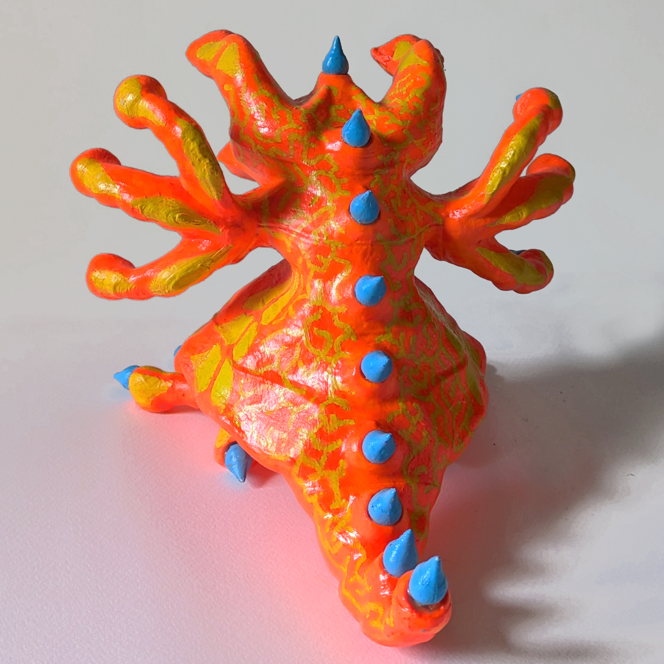 "ORANGE AZAZEL" is a toy sculpture measuring 17 x 20 x 24 cm. It has been 3D modelled and printed in PLA, painted in acrylics and finished in vinyl glue to protect it.